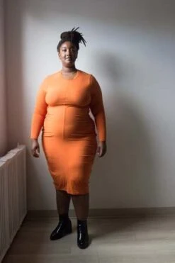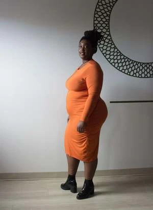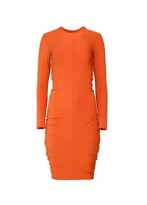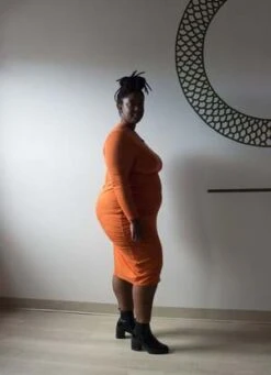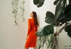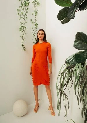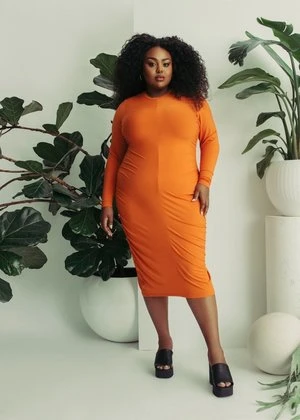 Hilary MacMillan’s Mesh Ruched Long Sleeve Dress is a blend of bamboo and spandex fabrics and produced in Canada. It features a flattering fit and ruching accents for the figure in all the right places.