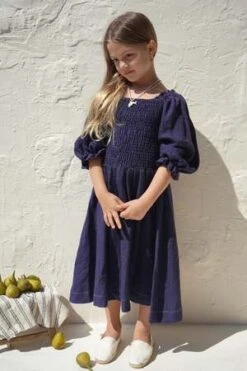New from House of Paloma ‘One Greek Summer’ for Spring/Summer 2022. Oversized puff sleeves and shirred bodice define this sweet summer dress. Cut from a soft, breathable linen in a deep navy blue.