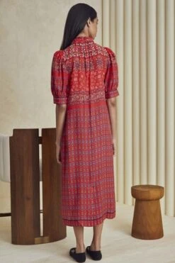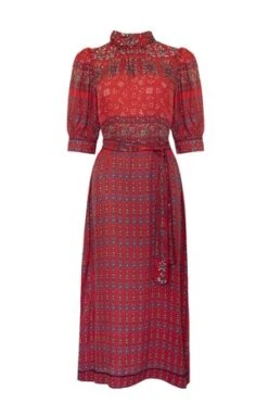 Langley strikes the perfect balance of sophisticated and edgy, pairing an ultra-feminine silhouette with a bold color palette. Featuring a mock neck and puff sleeves that cinch above the elbow, this midi dress has a flowy silhouette and comes with an optional self-tie belt.