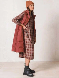 The Check Dress from Indi & Cold is crafted from sustainable woven viscose and is midi length. This midi dress features a round neckline and centre back button fastening, a fitted shoulder and long sleeves with cuff and button fastening. Featuring a boxy fit to the waist creates a flattering and comfortable silhouette, while the slightly gathered waist seam creating volume on the skirt adds an elegant touch.
