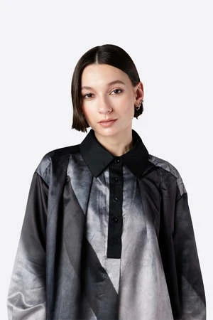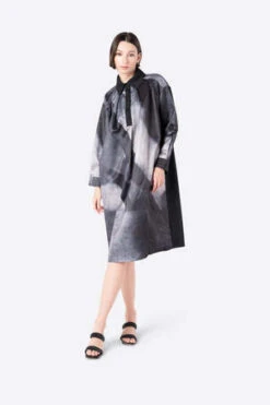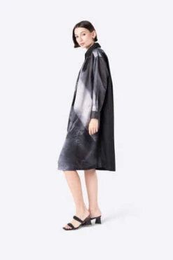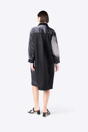 The EDEN panel shirt dress is comprised of an oversized print in a black / grey/washed white color story that resembles a very luminous dark sky. The sheen of the fabric adds to the elevated look of the otherwise very minimal classic shirt dress. 3 / 4 button closure and classic collar at front, this dress is effortlessly a statement and perfect for tall boots to elevate the entire look.