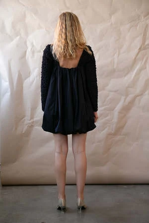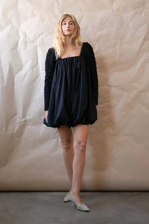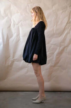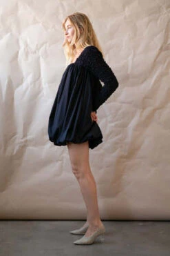 Balloon dress featuring slim smocked sleeves and bodice. An under-dress follows the body so you feel held, while the outer-dress poofs and swings. Gathered pleats along the enclosed elastic neckline makes for easy on / off. Pockets of course. Snaps at shoulder to hold bra straps.
