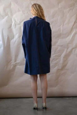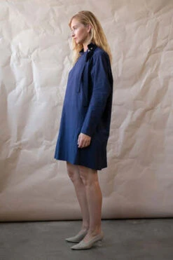 Mod 60s vibe mini dress with mock neck and ties at left shoulder, exaggerated forward shoulder and darts for shaping instead of a traditional arm hole; slim sleeves with architectural detail at underarm for easy range of movement. Front is fully lined, extra swing in the back. Slips on with hook and eye closure at back neck vent.