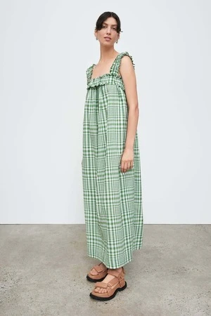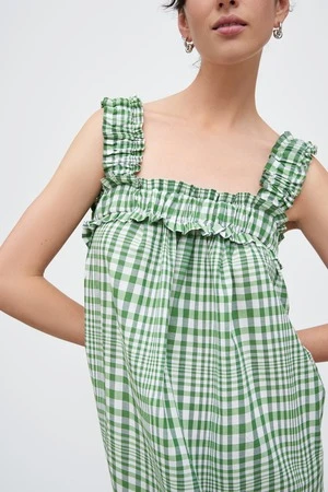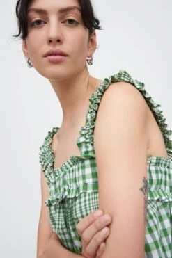 The Orchard Dress is an easy-wear slip on style made from 100% certified Fairtrade organic cotton voile that is semi-sheer. It has an oversized fit with elasticated, gathered frill detailing at the neckline and on the straps.
