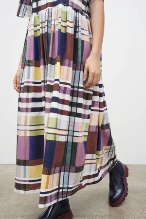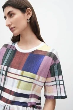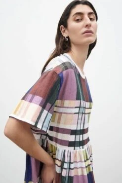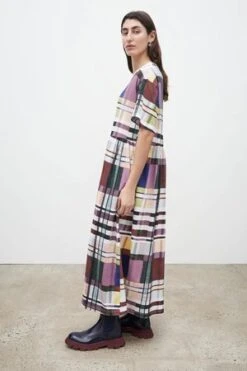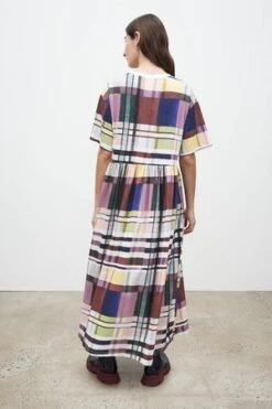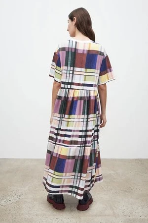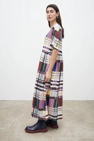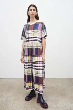 An easy t-shirt style dress made in midweight organic cotton jersey and digitally printed in our signature ribbon print. It falls to a midi-length and has a standard fit with a dropped shoulder and gathered waistline.