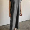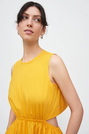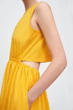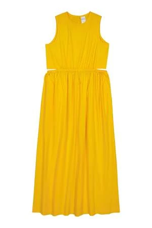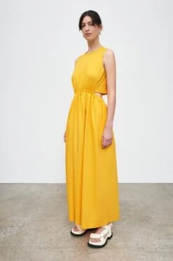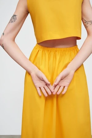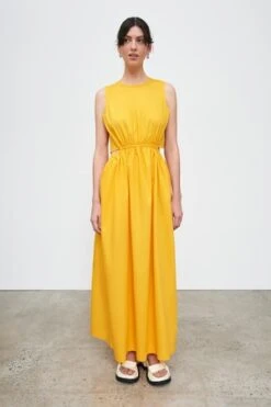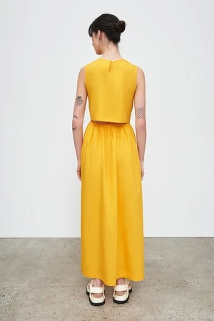 Perfectly in balance, the Tulip Dress is defined by a semi-detached bodice and full length A-line skirt. The elasticated waistline hugs your waist while baring a hint of back. The high crew neckline fastens with a single button at the back.