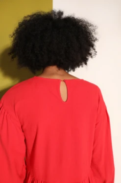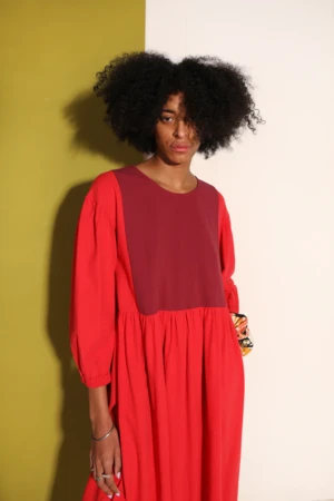 A relaxed fit smock dress with gathering at the waist and sleeves for a voluminous silhouette. Crafted from a rich cherry red cotton crepe with contrasting burgundy chest panel.
