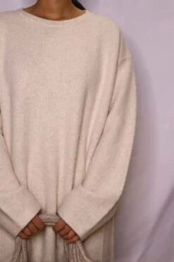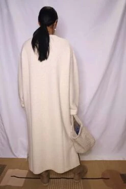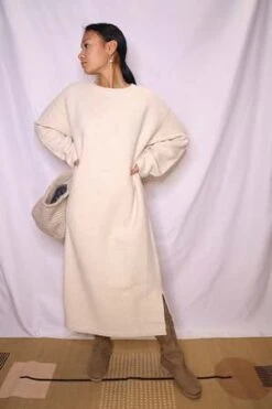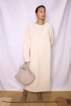 A full length knit dress with a relaxed straight silhouette. The Baby Alpaca / Merino blend has a soft felted hand with an easy drape. Designed with small side slits and raised seam details.