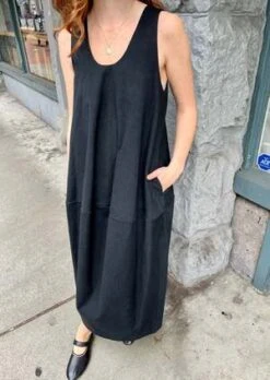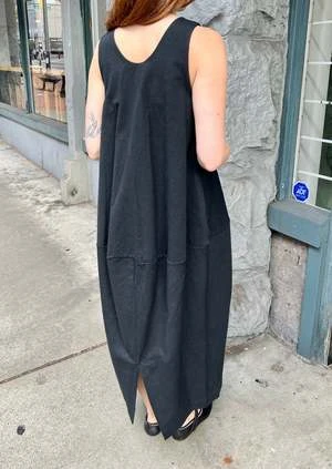 The Vessel Dress by Lauren Manoogian is a soft canvas sleeveless dress featuring a voluminous silhouette and side seam pockets. Vent at back for easy movement.