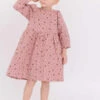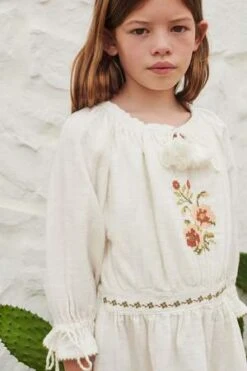Long sleeve dress with embroidery in cross-stitch. It has elastic cuffs and tassel tie detail at the front and cuffs. Exists for the mamma wardrobe, for a poetic look for small or important occasions.