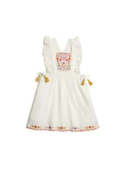 The apron dress returns this season in lovely soft colors with a festive look. Delicately embroidered and highlighted with ruffles, the Huguette model will please all the little stylish girls.