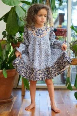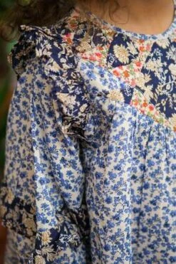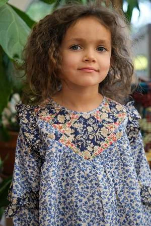 This patchwork dress celebrates the meticulousness of this grandmotherly skill. Its yokes is in liberty print gives off that original touch so typical of the Louise Misha know-how.