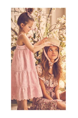 Achieve the perfect mommy and me style with this adorable kids’ version of LoveShackFancy’s Scarlett Dress. Crafted from sweet soft cotton with a babydoll silhouette, eyelet embroidery, and a shirred bodice, featuring skinny straps with tiny floral lace trim.