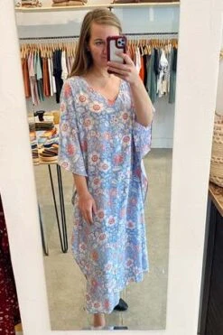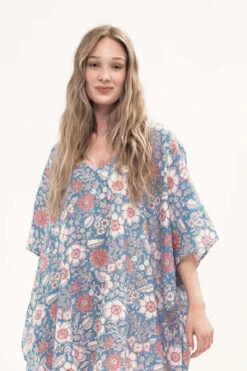 An effortless and flowing full length kaftan dress cut in lightweight, block printed modal with a feminine open neckline. Wear as a cover-up or a statement piece, belted or loose. One size fits most.