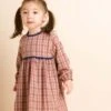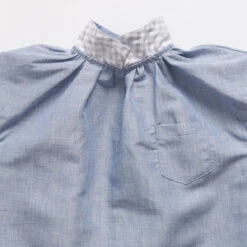 From Maki. Short sleeve baby girl dress in a crisp, pale blue cotton. Slim pointed collar with contrast gingham lining, slight A-line cut and full button closure at back.