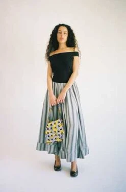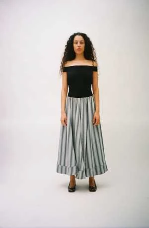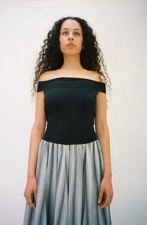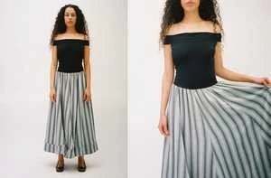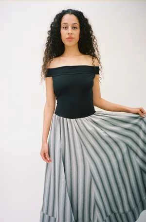 Off the shoulder dress with attached ruched skirt joined at the low waist. Stretchy black top, with striped ombre full skirt. This piece slips on overhead.
