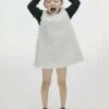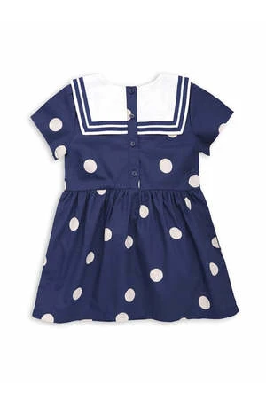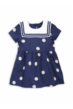 This navy blue sailor dress with a white polka-dot pattern and collar with blue trims is made from soft certified organic cotton. An elasticated waist and flowy skirt add a dainty touch. Snaps on the back for easy dressing.