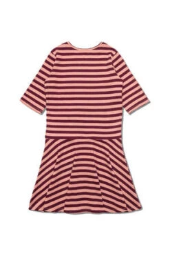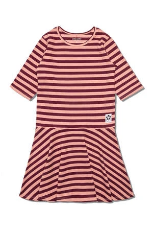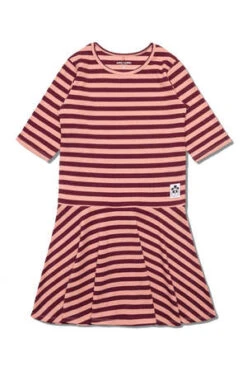 This rib knit stripe dress is made from soft certified organic cotton. An elasticated waist and flowy skirt add a dainty touch. Pair it with tights, leggings or trousers for a complete look.