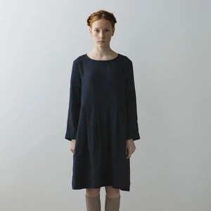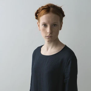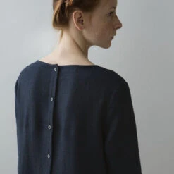 From Muku. A girl’s oversized long sleeve dress cut from a lightly textured, dark blue Lithuanian milled linen with subtle, tonal check print. Pleated skirt, scoop neck and back button closure. Simple, chic and beautifully crafted.