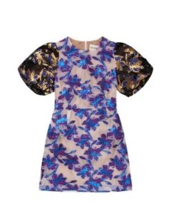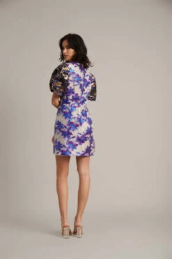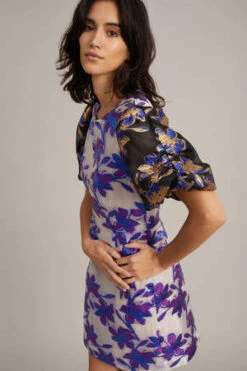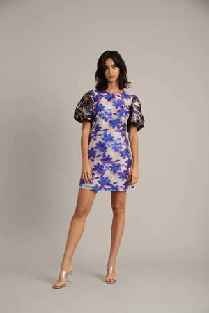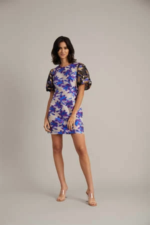 The Gamoso Dress in Purple by Munthe is a mini, puff sleeve dress crafted in contrasting metallic and brocade floral print with a round neck.