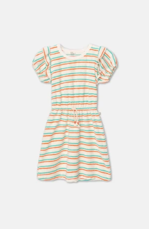 This striped, toweling dress features a round neck, short puff sleeves with ruffle details, and an elastic waist with a decorative drawstring.