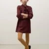 Velour dress with contrasting Peter Pan collar. Buttons at back and gathered seam with a V-shape at upper section. Long sleeves with elastic cuffs