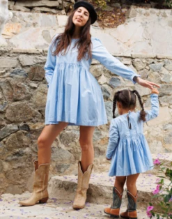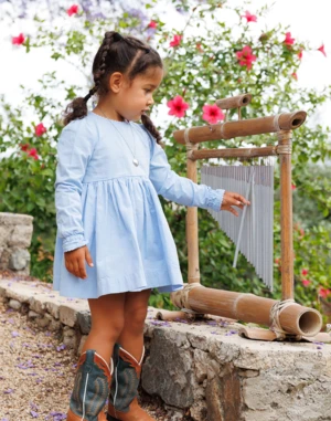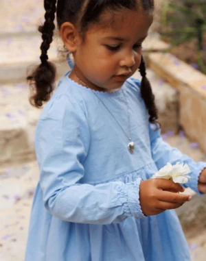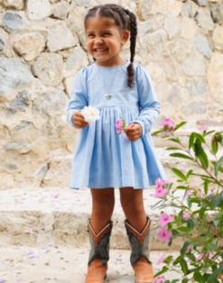 Made with 100% GOTS certified Organic Poplin and dyed with organic dyes, the kid’s Vale Dress in Blue Bell is our first long-sleeve dress made with your twirl-obsessed babe in mind. It features pockets, and the sweetest bluebell ric-rac detailing on the neckline and cuff. Your babe can rock this dress with boots as we transition to fall and layer with tights for cooler temps.