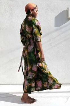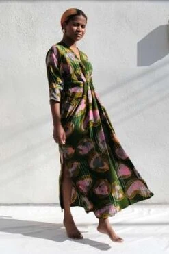 The Letsa is a long narrow wrap dress with batwing sleeves and a deep V neckline. This piece has soft pleats and a small cascade detail at the front waist. Ties wrap around the waist and the skirt opens at the side. side slits for even more drama and ease of wearing, and a slightly wider waist tie. Hand dyed for maximal dramatics.