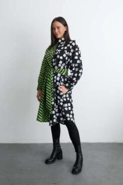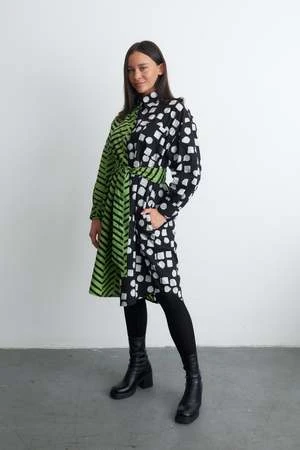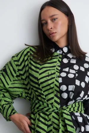 100% cotton unisex shirt dress. Easy oversized fit with a breast pocket and tie belt. White shell buttons.