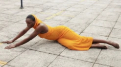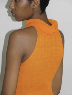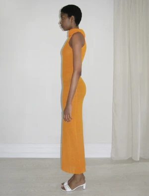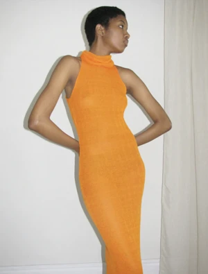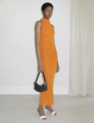 Draped high neck long dress in a brilliant orange tone. Fabric is sheer and shiny.
