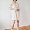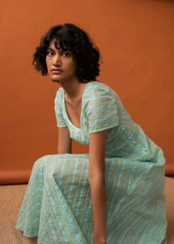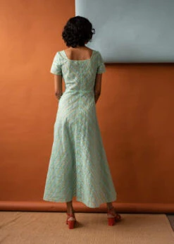 Limited edition bias cut dress in a sheer silk organza. Features short sleeves and a wide scoop neckline. The bodice is shaped with front darts, leading into a fitted waist and a long bias skirt and carefully finished internally with french and bound seams. The dress fastens at the side with covered buttons.