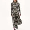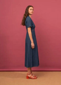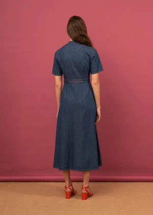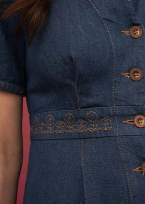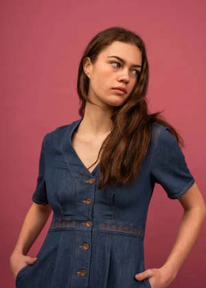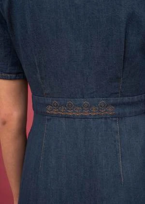 Short sleeve dress in a soft mid weight denim. Features concealed side pockets and tucks above and below the fitted waist. The front of the waistband is embroidered with a row of flowers, designed by textile artist Marta Buda. The dress fastens through the front with metal buttons.