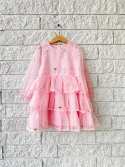 The Pink Chicken Girls Organza Fleur Dress is a charming long sleeve dress. Boasting a layered skirt and sheer sleeves. It’s a perfect look for the holiday season.