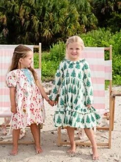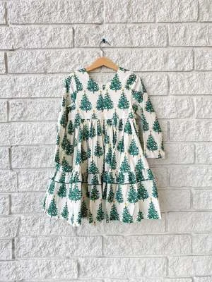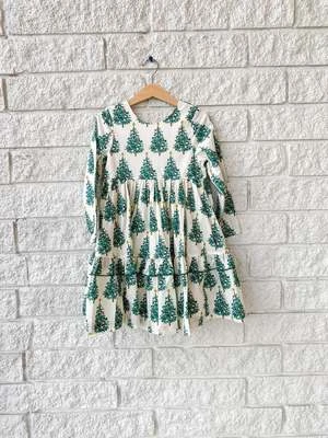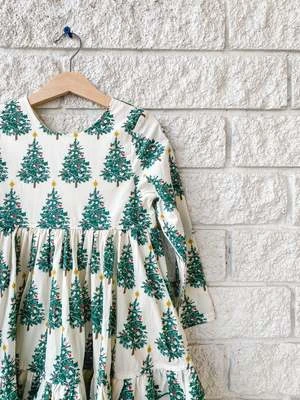 Pink Chicken’s Spencer Dress in Festive Forest is a long-sleeved cuteness overload. Featuring a charming Christmas tree pattern and ruffles gracing the hem. Perfect for the holiday season.
