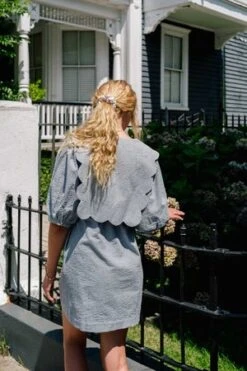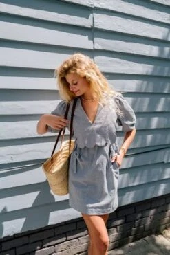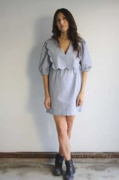 This sweet dress features a scalloped overlay, with ties at the side for the perfect amount of added shaping. Slightly puffed sleeves make this the perfect dress for day to night. Side pockets.