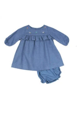 This Poeme & Poesie Prussian blue long sleeve dress is made with 100% cotton and features a hand embroidered yoke and ruffle. Detailed with playful patches around the neck. Finished with mother of pearl button back closure and matching bloomers.