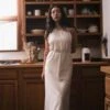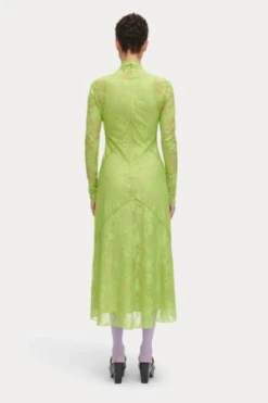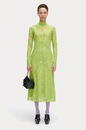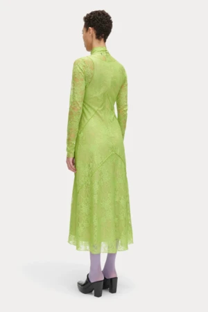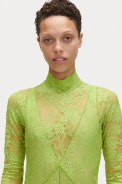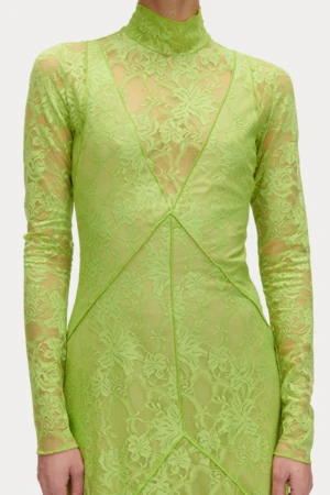 Bias-cut slip dress with a sheer lace turtleneck overlay, in a new, lingerie-inspired floral stretch leavers lace with scallop edges.