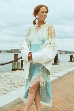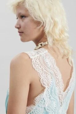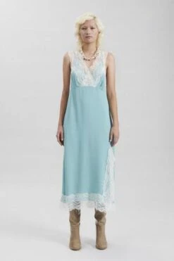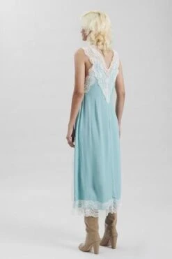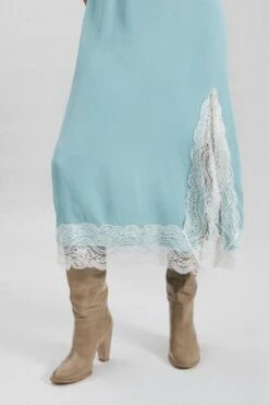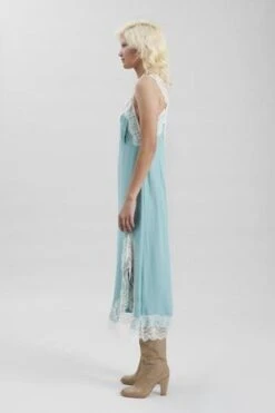 Slinky, V-neck maxi slip dress with empire waist and contrast lace trim, in our new Terrano Crepe, which has a soft matte face and sleek satin back that feels like silk–without the static cling.