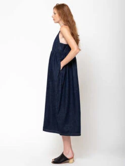 Rachel Comeys Fresco Dress is an oversized bib dress with a cocoon skirt that sits off the body, and this season is featured in lightweight denim.