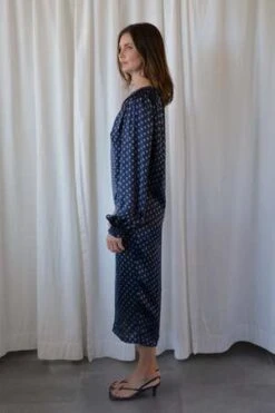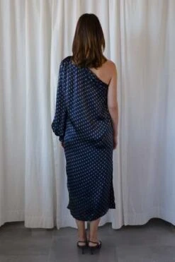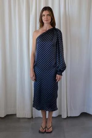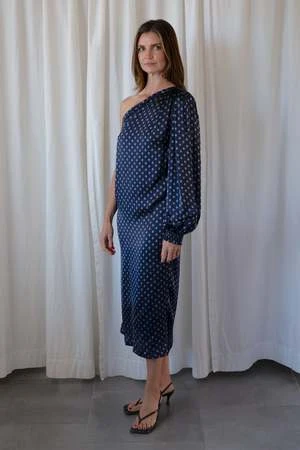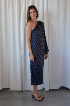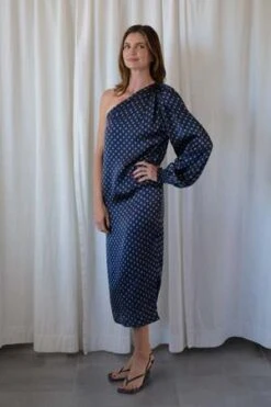 Navy polka dot dress in a fluid viscose with one sleeve, ruching at the shoulder, gathered cuff, and side slit.