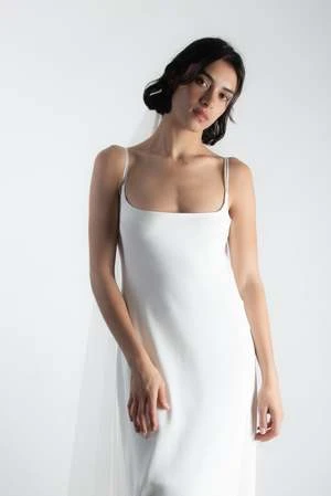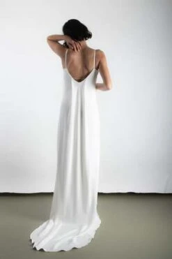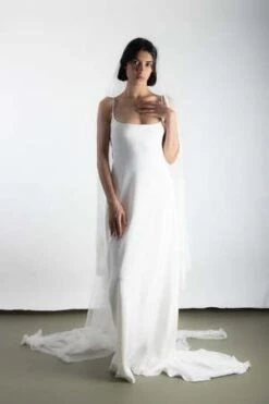 Bias cut maxi dress featuring fine rouleau double straps, and internal adjustable strap across the back. Low scoop back with a deep box pleat to hang effortlessly away from the body, extending into a train. Made from a beautiful matte silk, giving enough drape to shape the body without hugging. Please note, we have left the length generous to accommodate a taller height. Let us know if you would like it shortened. (Please note, veil is used for styling only).