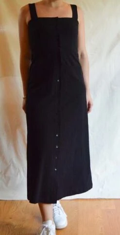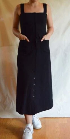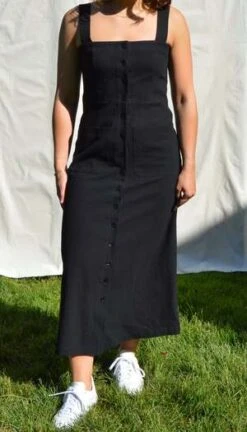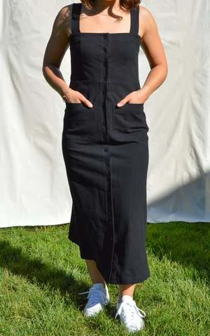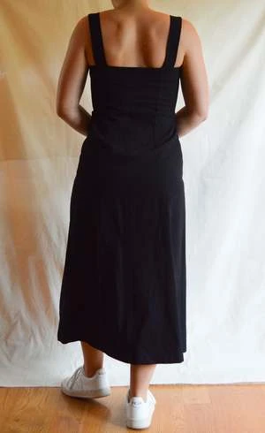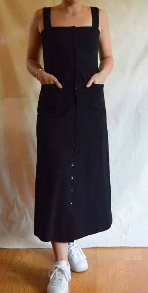 Details: This might be the most flattering dress you will put on. Structured medium weight linen blend, midi length, square neckline, square detailed button down front, functional front pockets.