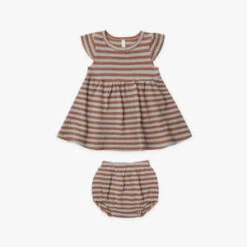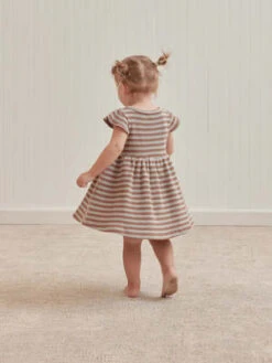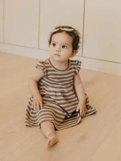 Our Flutter Sleeve Dress in our organic waffle fabric features a full skirt, and flutter details on the sleeves. Perfect for twirling. All sizes include coordinating bloomers.