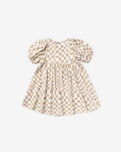 This adorable dress features puff sleeves and a babydoll inspired silhouette with a curved waistline. Scooped neck and button back closure.