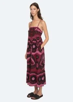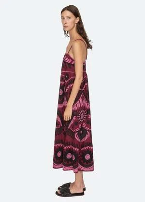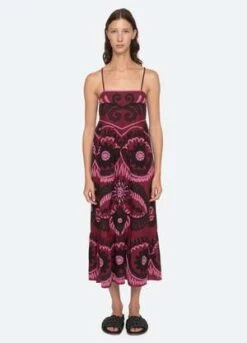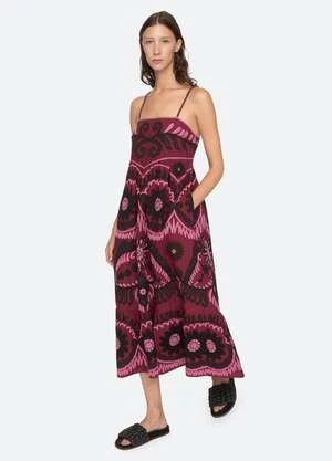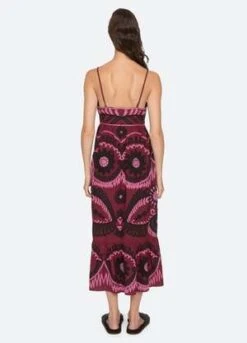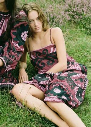 The Charlough graphic print slip dress features ruched straps and embroidered applique detailing throughout.