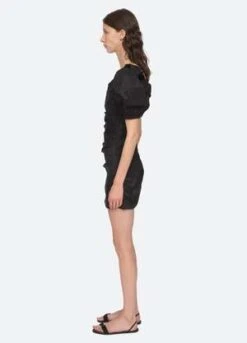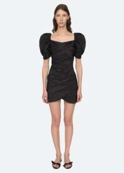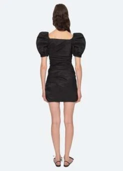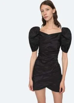 The Diana taffeta dress features a sweet heart neckline, short puff sleeves and ruched detailing throughout.