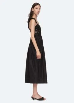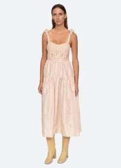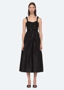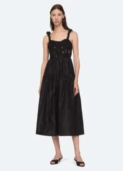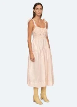 The Evita embroidered corset dress features a lace corset bodice, ruched straps and full skirt.