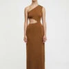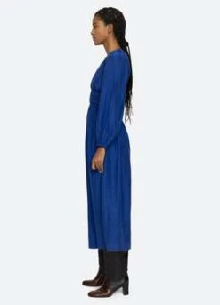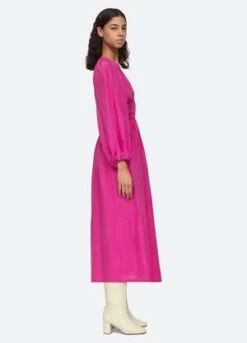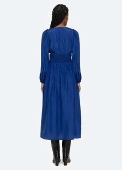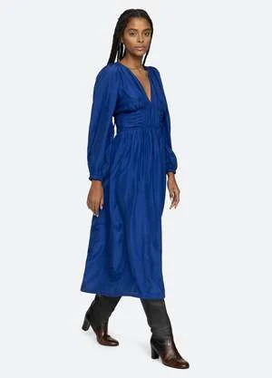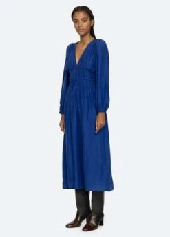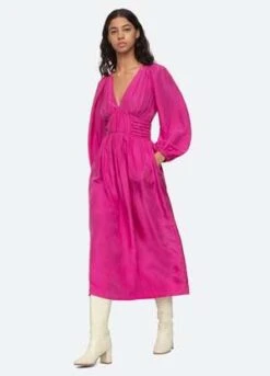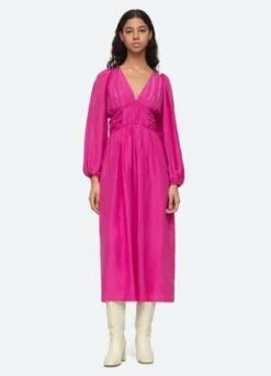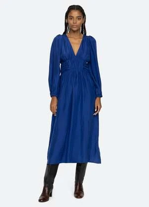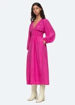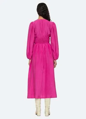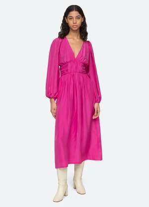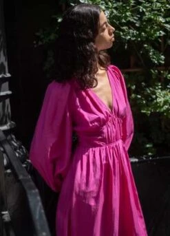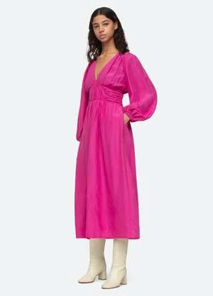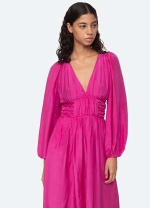 The Fabiola silk habotai dress features a v-neckline, ruched waistline with smocked back and long puff sleeves.