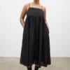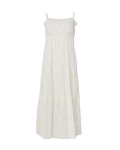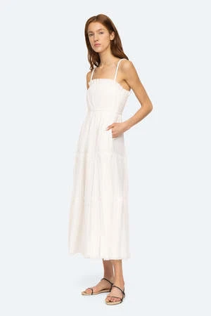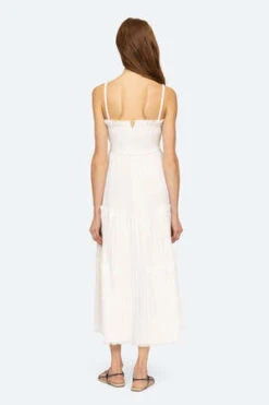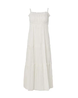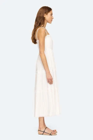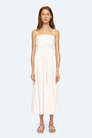 The Greir Pleating Slip Dress in Cream by Sea New York is a midi length, tiered dress featuring a smocked back and raw edge detailing.