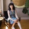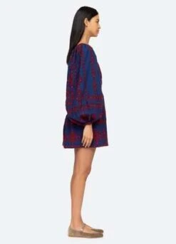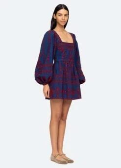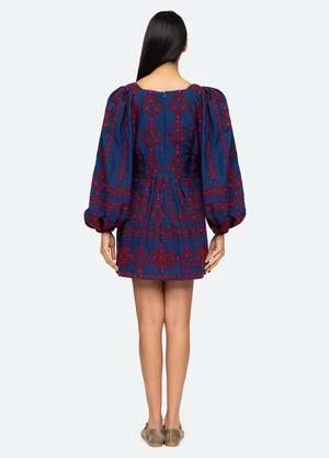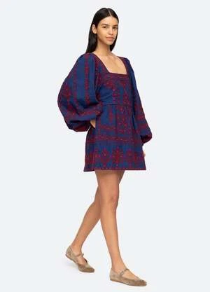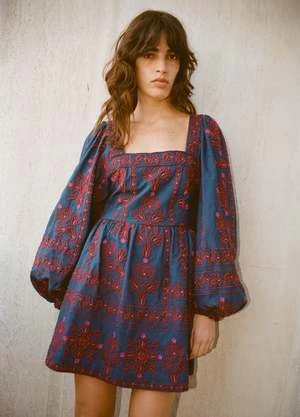 The Petunia embroidered dress features voluminous long puff sleeves, square neckline and mini silhouette.